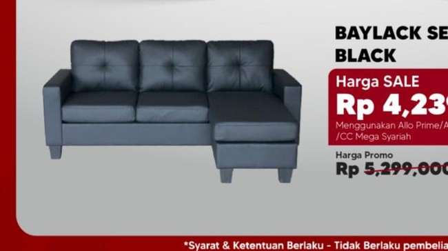 Harga sofa pun bisa lebih murah lagi jika menggunakan kartu kredit Bank Mega atau Bank Mega Syariah, Allo Prime, dan Allo Bank jadi Rp 4.239.200. Artinya, pembeli hemat Rp 1,759,800 jika memaksimalkan model pembayaran tersebut.