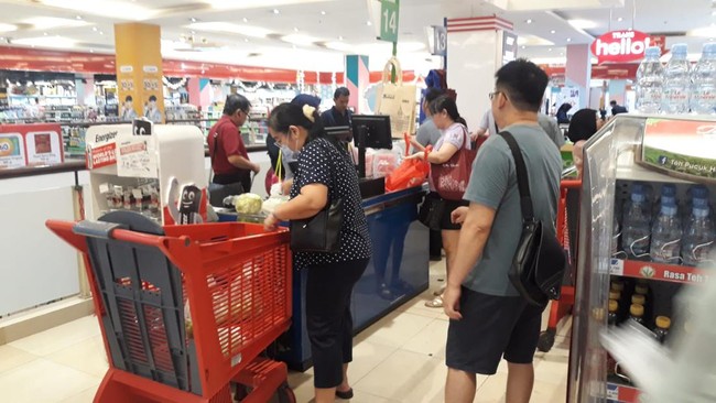 Misalkan saja seperti yang terjadi di Transmart Cempaka Putih. Berdasarkan pantauan detikcom, pelanggan masih memadati area kasir dengan troli hingga antrian yang tampak mengular.