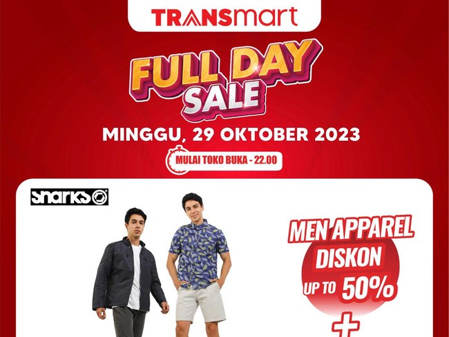 Beberapa merek pakaian diberi diskon besar-besaran. Untuk busana pria, pertama adalah Sharks. Transmart memberi diskon up to 50%. Diskon ekstra 20% juga diberikan bagi pembeli membayar menggunakan Allo Prime, Allo Paylater dan kartu kredit Bank Mega atau Bank Mega Syariah.