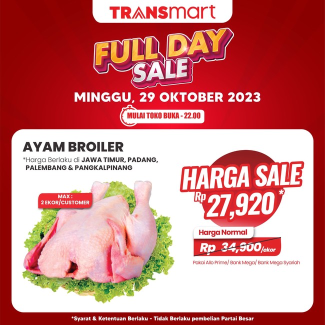 Di Transmart yang berada di wilayah Jabodetabek dan Karawang harga ayam boiler promo di harga Rp 29.200. Harga normalnya adalah Rp 36.500 per ekor.