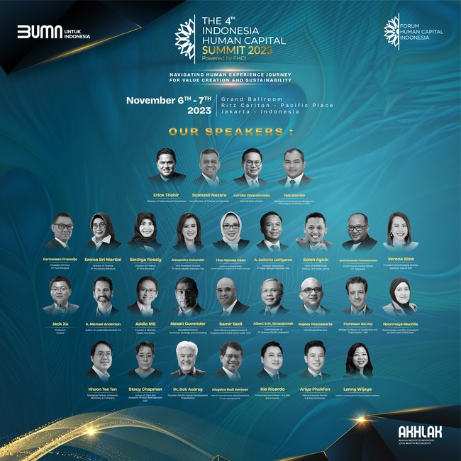 Menteri BUMN RI Erick Thohir juga direncanakan hadir dalam gelaran The 4th Indonesia Human Capital Summit (IHCS) pada awal sesi Plenary hall hari pertama. Kemudian ada Direktur Utama PT PLN (Persero) Darmawan Prasodjo, President and Managing Director Southeast Asia at SAP Verena Siow, Managing Director Accenture Strategy and Consulting Nesan Govender, dan EY Asean Workforce Advisory Leader Samir Bedi, Singapore Government & Public Sector Leader Ernst & Young Advisory Pte. Ltd.
