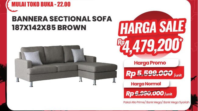 Pelanggan bisa mendapatkan produk Bannera Sectional Sofa 187x142x85 Brown dengan harga promo Rp 5.599.000 dari harga normal Rp 6.990.000. Harga sofa bisa lebih murah lagi jika menggunakan kartu kredit Bank Mega atau Bank Mega Syariah, Allo Prime, dan Allo Bank jadi Rp 4.479.200. Artinya, pembeli hemat Rp 2.510.800 dari harga normal.