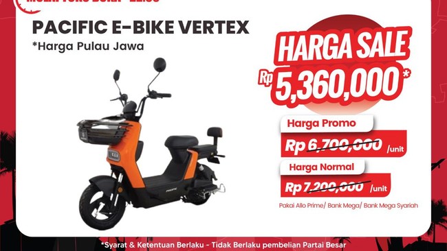 Pelanggan bisa mendapatkan sepeda listrik Pacific E Bike Vertex dengan harga promo Rp 6.700.000 dari harga normal Rp 7.200.000 untuk pelanggan di Pulau Jawa. Transmart pun memberi diskon tambahan menjadi Rp 5.360.000 jika pelanggan membayar menggunakan Allo Prime, Allo Paylater, dan kartu kredit Bank Mega atau Bank Mega Syariah. Hal ini berarti berarti pelanggan hemat Rp 1,840,000 dari harga normal.
