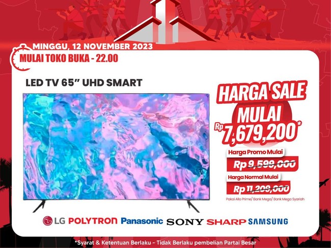 LED TV 65" UHD Smart TV. Harga normal TV tersebut mulai dari Rp 11.200.000. Harga promonya mulai Rp 9,599.000.