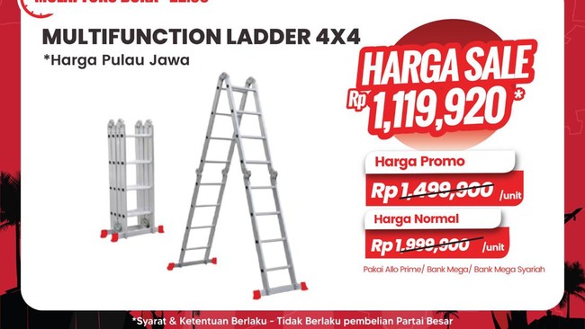 Di Transmart Full Day Sale, produk multifunction ladder 4x4 atau tangga multifungsi sedang promo menjadi Rp 1.499.900/unit di Transmart Pulau Jawa. Padahal harga normalnya Rp 1.999.900/unit.