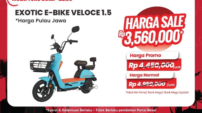 Pada momentum kali ini, pelanggan bisa mendapatkan sepeda listrik Exotic E-Bike Veloce 1.5 dengan harga promo Rp 4.450.000 dari harga normal Rp 4.950.000. Nggak perlu takut boncos, pelanggan bisa mendapatkan harga lebih murah jika bertransaksi menggunakan Allo Prime, Kartu Kredit Bank Mega dan Bank Mega Syariah jadi Rp 3.560.000. Pelanggan bisa hemat dengan total Rp 1.390.000.