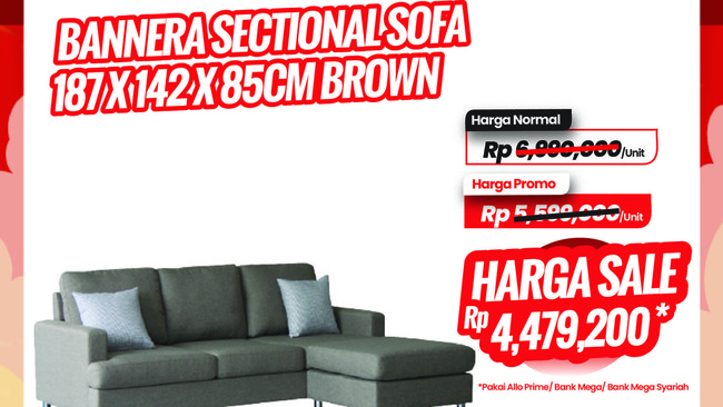 Khusus dalam gelaran kali ini, ada diskon jumbo untuk produk Bannera Sectional Sofa 187x142x85 cm Brown. Produk ini didiskon dari harga normal Rp 6,99 juta per unit menjadi Rp 5,59 jutaan saja per unit. Belanja jadi lebih hemat Rp 1,4 jutaan.