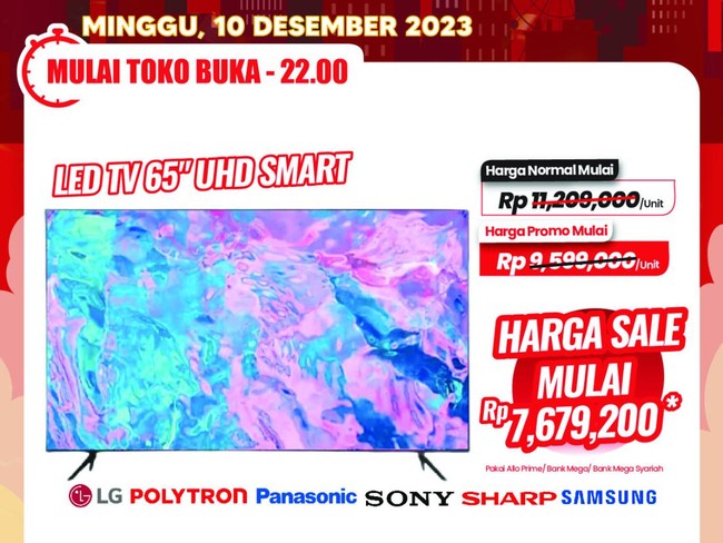 Salah satunya adalah TV LED 65 inch UHD Smart. Harga normal TV tersebut mulai dari Rp 11.209.000. Namun harga promonya mulai Rp 9.599.000. Jika menggunakan Allo Prime, Allo Paylater, kartu kredit Bank Mega atau Bank Mega Syariah maka pelanggan bisa mendapatkan TV tersebut mulai dari Rp 7.679.200. Artinya bisa menikmati diskon Rp3.529.800 dari harga normal.