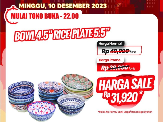 Diskon yang ditawarkan tak main-main mencapai 50+20% dan berkalu untuk berbagai produk. Salah satunya adalah piring dan mangkok yang kerap dicari para ibu rumah tangga.