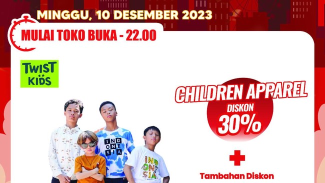 Beli pakai untuk anak di Transmart Full Day Sale, Minggu (10/12/2023) dijamin murah karena ada diskon hingga 50+20% dan harga spesial. Promo ini berlaku seharian mulai dari toko buka sampai pukul 22.00 atau jam 10 malam.