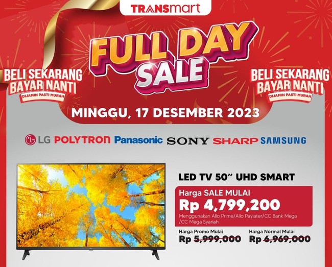 Diskon besar-besaran bisa didapatkan pelanggan yang membayar menggunakan Allo Prime, Allo Paylater dan kartu kredit Bank Mega atau Bank Mega Syariah. Barang elektronik menjadi yang paling banyak mendapatkan diskon gede-gedean di Transmart Full Day Sale.