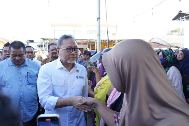 Menteri Perdagangan Zulkifli Hasan meninjau Pasar Pagi Sambas, Kabupaten Sambas, Kalimantan Barat. Masyarakat pun antusias menyambut kedatangan Zulhas di pasar tersebut.
