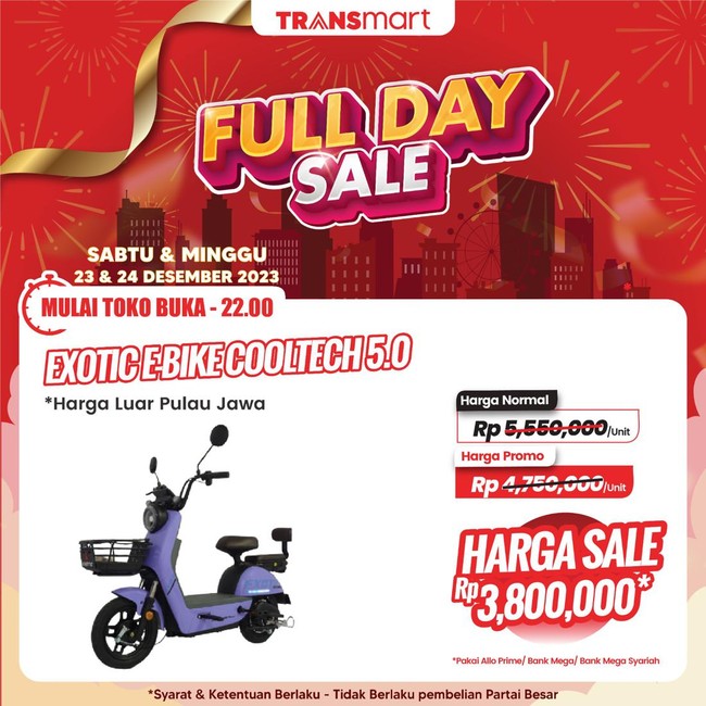 Di Transmart Full Day Sale, beli sepeda listrik Exotic E-Bike Cooltech 5.0 ada harga promo Rp 4.375.000/unit dari harga normal Rp 5.250.000/unit. Harga ini berlaku di Transmart Pulau Jawa.
