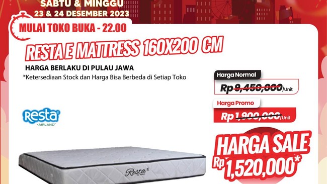 Salah satunya ada kasur Resta E Mattres ukuran 160x200 cm dibanderol dengan harga Rp 1.520.000 Padahal harga aslinya Rp. 9.450.000.