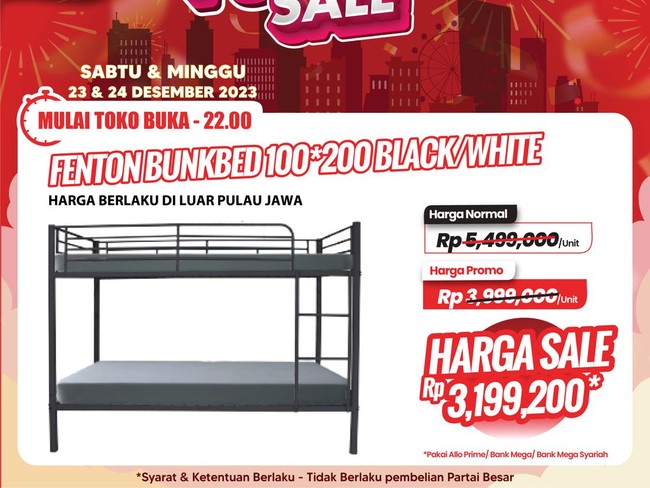 Untuk pelanggan di luar Pulau Jawa, harga normal Fenton Bunkbed 100*200 Black/White ini Rp 5.499.000 per unit. Kemudian dengan harga promo menjadi Rp 3.999.000.