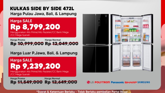Pelanggan setia Transmart dapat menikmati promosi diskon menarik bila belanja langsung ke gerai Transmart. Untuk kulkas Side by Side 472L di Pulau Jawa, Bali dan Lampung dengan harga Rp 8.799.200 saja jika menggunakan Allo Prime, Allo Paylater, dan kartu kredit Bank Mega atau Bank Mega Syariah.
