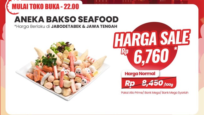 Harga-harga diskon di atas bisa didapatkan apabila membayar dengan Allo Prime, Kartu Kredit Bank Mega atau Bank Mega Syariah. Selain aneka bakso dan seafood, beragam produk juga didiskon besar-besaran di Transmart Full Day Sale. Ada TV, AC, kasur, dan masih banyak yang lainnya.
