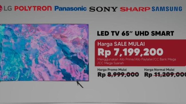 Salah satunya adalah TV LED 65" UHD Smart TV dari berbagai merk. Harga normal TV tersebut mulai dari Rp 11.209.000. Namun harga promonya mulai Rp 8,999.000. Jika menggunakan Allo Prime, Allo Paylater, kartu kredit Bank Mega atau Bank Mega Syariah maka pelanggan bisa mendapatkan TV tersebut mulai dari Rp 7.199.200. Hal ini berarti pelanggan setia untung 4,009,800 dari harga normal.