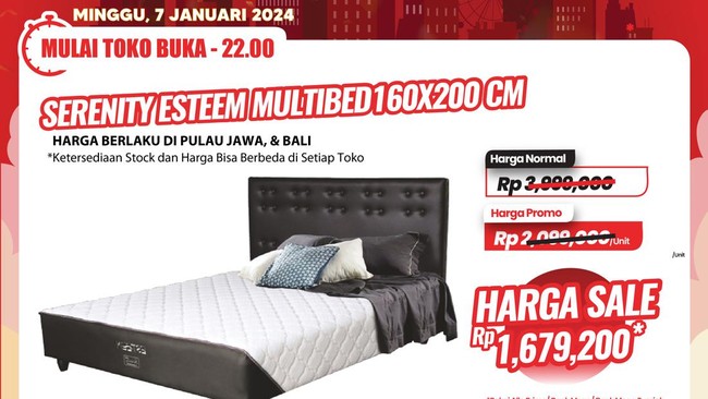 Selama full day sale Transmart menawarkan diskon hingga 50+20% untuk sejumlah produk. Salah satunya adalah kasur nyaman dari Serenity Esteem Multibed 160X200 cm.