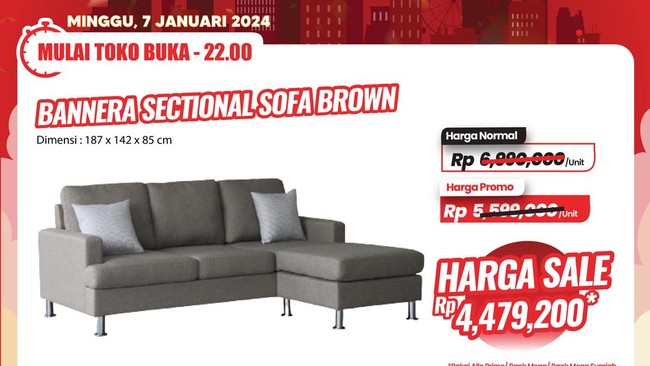 Pelanggan bisa mendapatkan produk Bannera Sectional Sofa Brown 187x142x85 cm didiskon menjadi Rp 5.999.000 untuk satu unit dari harga normal Rp 6.990.000.