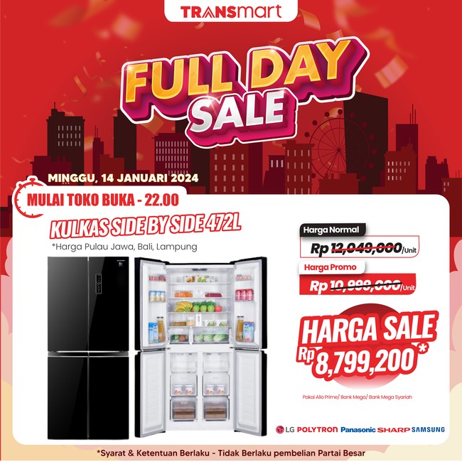 Salah satu produk yang dapat diskon jumbo ialah kulkas Side by Side 472L. Spesial untuk besok, produk tersebut ditawarkan dengan harga promo Rp 10.999.000, dari harga normal Rp 12.049.000. Harga ini berlaku di Pulau Jawa, Bali dan Lampung.