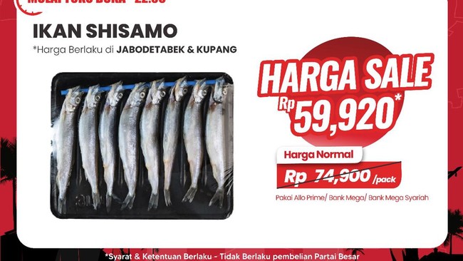 Ikan shisamo segar dan berkualitas bisa didapat di Transmart. Lewat program Transmart Diskon Tiap Hari 20%, harga ikan shisamo yang tadinya Rp 74.900 per kemasan, menjadi Rp 59.920 per kemasan. Artinya ada diskon hampir Rp 15 ribu untuk pembelian ikan shisamo.