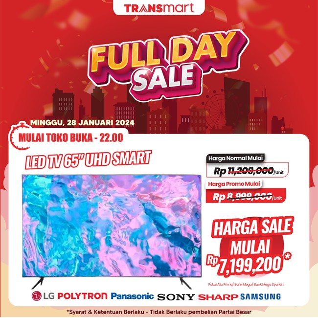 Gelaran ini hadir spesial di hari Minggu (28/1/2024), serentak di seluruh gerai Transmart di Tanah Air. Transmart Full Day Sale digelar seharian penuh, mulai dari toko dibuka s.d pukul 22.00 WIB.