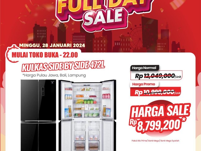 Diskon ini berlangsung mulai buka toko hingga pukul 22.00 WIB. Salah satu promo yang tersedia adalah kulkas Side by Side 472L semua merek ditawarkan dengan harga Rp 10.999.000. Padahal harga normal Rp 12.049.000.