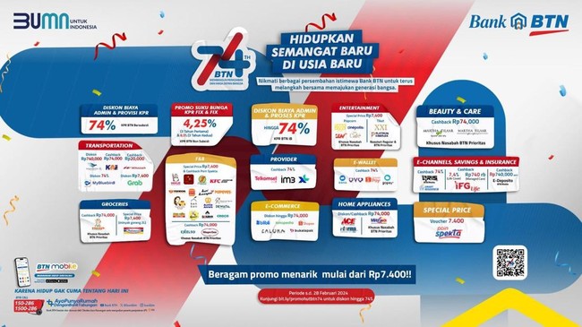 "Sebagai bentuk rasa syukur dan bahagia kami, dalam memeriahkan HUT ke-74, BTN menggelontorkan berbagai promo diskon mulai dari diskon KPR, entertainment, isi pulsa, e-commerce, kuliner hingga transportasi, semuanya serba 74, ada yang diskon 74%, ada juga diskon Rp 74.000, ada special price Rp 7.400 hingga cashback Rp 740.000," ujar Corporate Secretary BTN Ramon Armando, dalam keterangan tertulis, Rabu (7/2/2024).