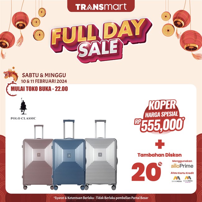 Khusus selama gelaran tersebut, koper Polo Classic dibanderol dengan harga spesial Rp 555.000 untuk semua pelanggan. Makin hemat karena tambahan diskon 20% dengan pembayaran menggunakan Allo Prime, kartu kredit Bank Mega, atau Bank Mega Syariah, sehingga cukup membayar Rp 444.000.
