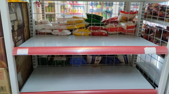 Padahal terdapat dua rak berukuran besar yang ditempatkan khusus untuk berbagai jenis dan merek beras. Namun, kini hanya kardus-kardus mie instan yang mengisinya.