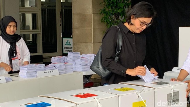 Dilihat detikcom, Rabu (14/2/2024), TPS 73 di Jalan Mandar X Sektor 3A, Bintaro Jaya, Tangerang Selatan tempat nyoblos Sri Mulyani memperlihatkan Prabowo-Gibran unggul dengan 87 suara. Sementara itu, pasangan Anies Baswedan-Muhaimin Iskandar hanya 72 suara dan Ganjar Pranowo-Mahfud Md 48 suara.
