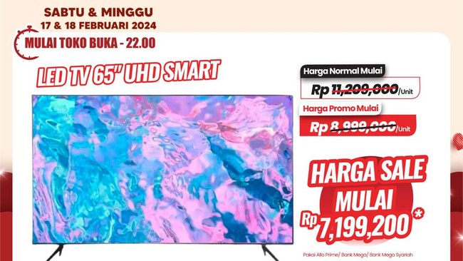 Jika pembayaran menggunakan Allo Prime, kartu kredit Bank Mega atau Bank Mega Syariah, bisa dapat potongan lagi 20% menjadi Rp 7.199.200/unit. Artinya pembeli bisa hemat mulai Rp 4.009.800 dari harga normal saat membeli TV LED 65" UHD Smart TV.