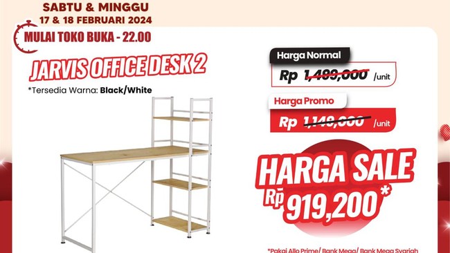 Produk ini bisa digunakan sebagai meja bekerja atau menyimpan peralatan kerja. Adapun Jarvis Office Desk 2 dibanderol hanya Rp 1.140.000 dari harga normal Rp 1.499.000 per unit. Artinya ada diskon hingga mencapai Rp 359.000.
