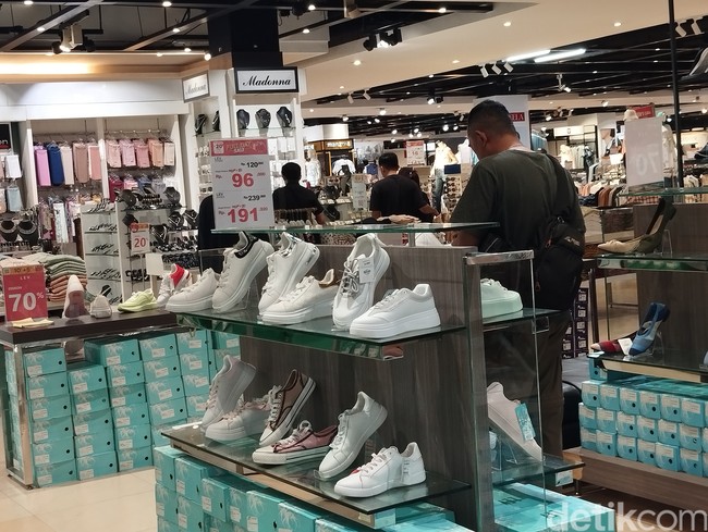 Berdasarkan pantauan detikcom, Jumat (17/2/2024), pembeli mulai menyerbu area sepatu dan sandal. Mereka melihat-lihat produk yang dipajang dan menjajal produk yang diminatinya.
