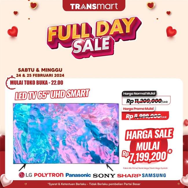Di Transmart Full Day Sale, pembeli bisa mendapatkan TV LED 65" UHD Smart TV dengan harga promo mulai Rp 8.999.000. Harga itu sudah potongan dari harga normal mulai Rp 11.209.000.