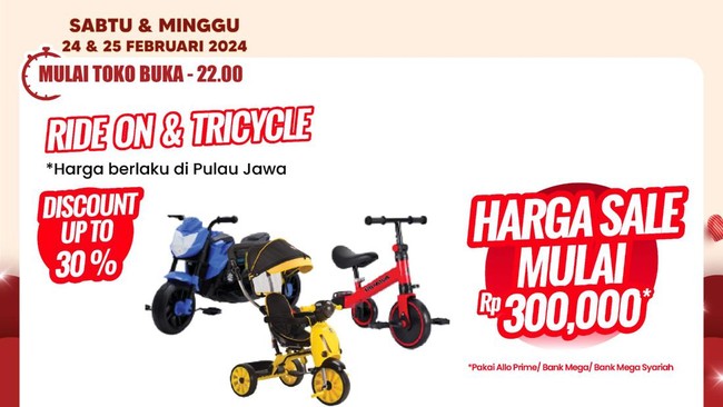 Sebagai catatan harga tersebut berlaku untuk transaksi menggunakan Allo Prime, Bank Mega, atau Bank Mega Syariah. Dapatkan banyak promo untuk beragam macam produk mulai dari sepeda, elektronik, kasur, hingga buah-buahan.