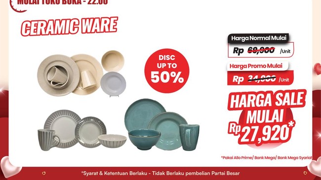 Khusus hari ini, Minggu (31/12/2023), ada diskon hingga 50% dan tambahan diskon 20% apabila pembayaran menggunakan Allo Prime, Allo Paylater dan kartu kredit Bank Mega atau Bank Mega Syariah. Diskon ini berlangsung mulai buka toko hingga pukul 22.00 waktu setempat.