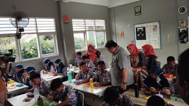 Simulasi program makan siang gratis digelar hari ini. Menteri Koordinator Bidang Perekonomian Airlangga Hartarto menyempatkan diri untuk menyambangi kantin sekolah.