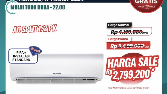 Misalnya saja AC Split ½ PK mulai ditawarkan dengan harga promo Rp 3.499.000 dari harga awal Rp 4.199.000. Makin murah menggunakan Allo Prime, Kartu Kredit Bank Mega atau Bank Mega Syariah, jadi Rp 2.799.200. Pelanggan bisa menghemat dengan total Rp 1,39 jutaan.