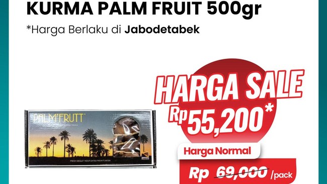 Khusus di wilayah Jawa Tengah, kurma ini ditawarkan dengan harga sale Rp 53.520 dari harga normal Rp 66.900. Kemudian, di wilayah Jawa Timur ditawarkan dengan harga sale Rp 57.520 dari harga normal Rp 71.900.