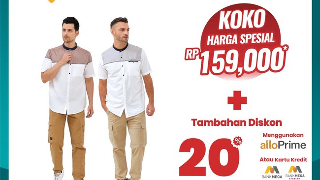 Ada diskon 35% untuk baju koko Alisan. Pelanggan bisa mendapat tambahan diskon 20% jika menggunakan Allo Prime, kartu kredit Bank Mega dan kartu kredit Bank Mega Syariah.