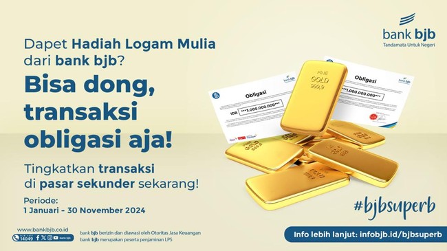 bank bjb luncurkan program bjb Superb (Surprise for Retail Bonds) 2024 dengan memberikan reward berupa logam mulia pada nasabah yang aktif bertransaksi. bjb Superb merupakan sebuah program pemberian reward berupa logam mulia bagi nasabah perorangan yang aktif melakukan transaksi pembelian maupun penjualan surat berharga di pasar sekunder dengan akumulasi transaksi minimal Rp 1.000.000.000 selama periode penawaran yang berlangsung mulai dari tanggal 1 Januari hingga 30 November 2024.