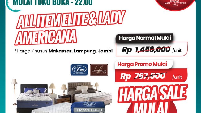 All Item Elite & Lady Americana ditawarkan dengan harga promo mulai dari Rp 729.000, dari harga normalnya mulai dari Rp 1.458.000. Harga ini berlaku untuk Jawa dan Bali. Pelanggan bisa mendapatkan kasur ini dengan harga sale mulai dari Rp 583.200.
