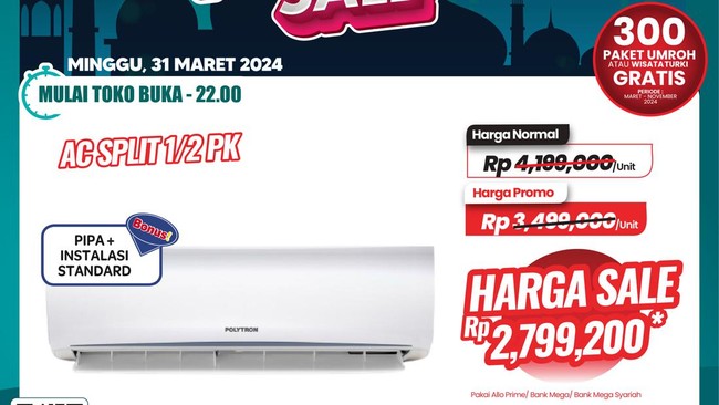 Transmart menghadirkan berbagai promo menarik melalui Transmart Full Day Sale di bulan spesial Ramadan ini. Di Full Day Sale, AC Split 1/2 PK didiskon hampir Rp 1,5 juta.