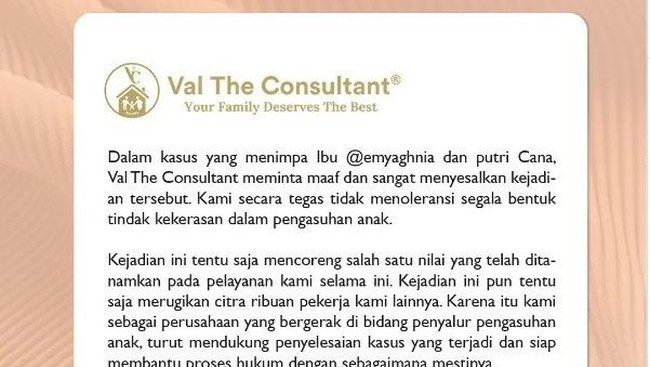 Padahal Val The Consultant Indonesia berdiri sejak 2012. Yayasan tersebut merupakan layanan konsultan resmi dan manajemen rekrutmen profesional pengasuhan anak, pekerja rumah tangga dan driver.