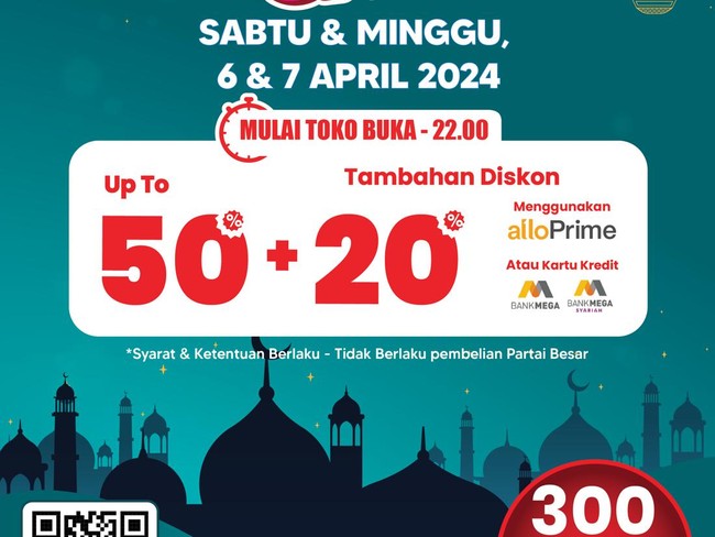Ada juga Diskon tambahan 20% pun akan diberikan kepada pelanggan apabila bertransaksi menggunakan Allo Prime, Allo Paylater, kartu kredit Bank Mega, atau kartu kredit Bank Mega Syariah