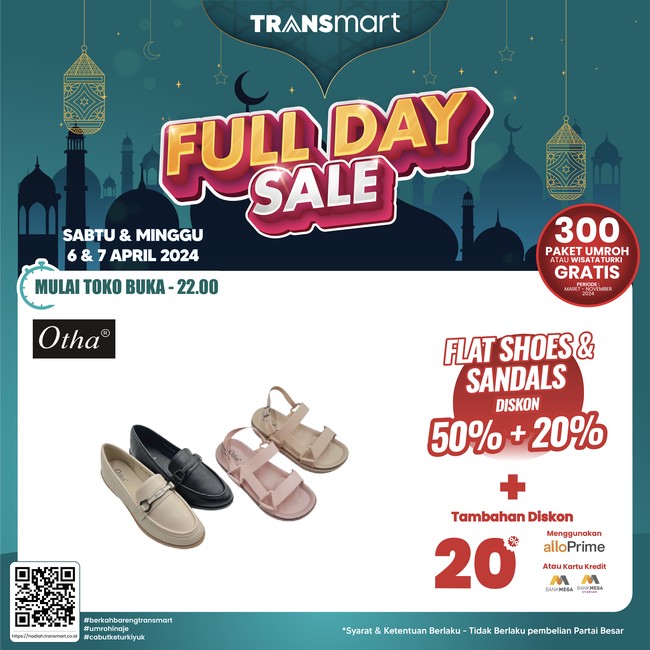 Salah satunya ialah sepatu keluaran Otha Spesial di Transmart, sepatu dan sandal wanita promo potongan harga 50%+20%. Nggak cuma itu, pembeli bisa dapat tambahan diskon 20% kalau pakai Allo Prime, Allo Paylater, kartu kredit Bank Mega, atau Bank Mega Syariah.