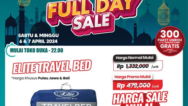 Produk Elite Travel Bed diskon jadi jadi cuma dari Rp 479.000 aja dari harga normal mulai dari Rp 1.332.000 juta. Harga ini berlaku di Pulau Jawa dan Bali.
