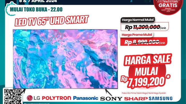 Adapun TV LED ukuran 65 inch mulai dijual dengan harga Rp 8.999.000 dari harga awal Rp 11.209.000. Nggak takut boncos kalau menggunakan pembayaran di atas, harganya jadi Rp 7.199.200. Dengan begitu, pelanggan dapat hemat Rp 4 jutaan.